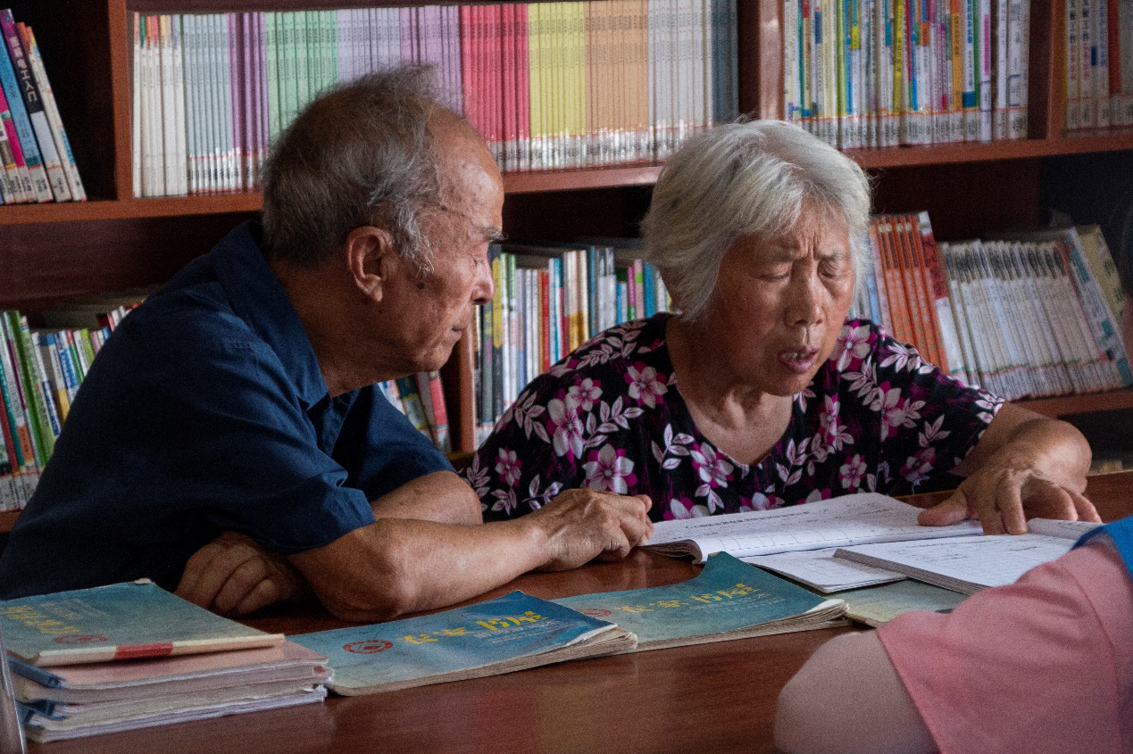 ▲夏昭炎教授与老伴杨莲金为志愿者介绍读书屋情况