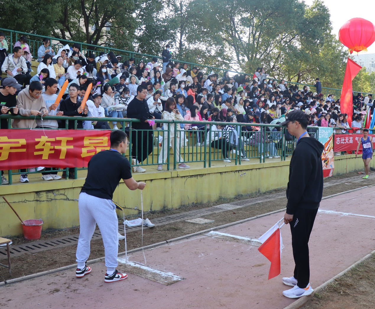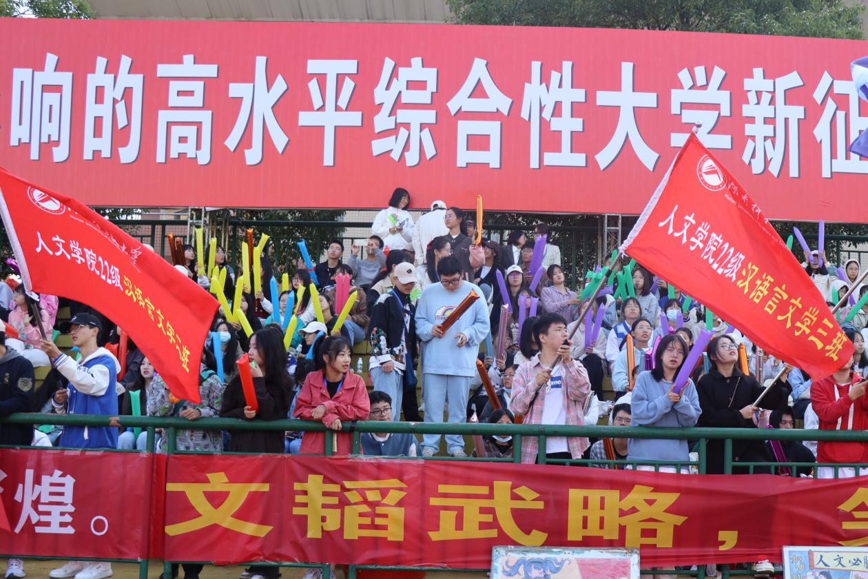 在运动员们咬紧牙关为个人与公司的荣誉而战时,观众席上旗帜飘飘、声浪滚滚,整齐划一的加油声与口哨声更加坚定了人文健儿们冲线的决心。组织部成员们的工作便是引导同学们为运动员们加油助威。谈及本次运动会工作,22级历史三班的童昊天说:“很高兴能够带动大家给运动员们加油,希望我们的加油声可以给运动员们提供动力,再创佳绩。”同样身为组织部委员的郑子强表示:“这次活动提高了我与人交流的能力,也让我明白了团队之间只有团结合作才能披荆斩棘、共破难关。”