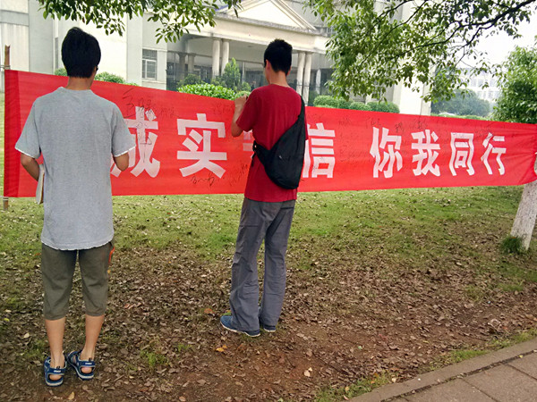 为落实公司国家助学贷款的宣传管理工作,提高员工诚信意识,加强员工诚信教育,5月25日,公司联合生命科学公司,物理与电子科学公司在七区宿舍区举行以“诚实守信,你我同行”为主题的诚信展板活动。公司党委副书记颜柯、学工办老师贺丽到现场与同学们一同参与此次活动,并在横幅上签名,许下诚实守信承诺。