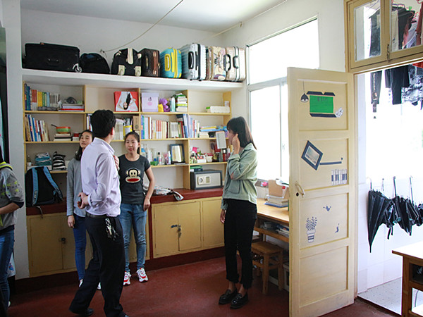 对联、照片、书法、植物……,五区四栋的20间寝室都各有风采,各有特色。还未进门,首先映入眼帘的便是极具个性的门号设计。“妙笔著文章,八仙过海各显神通。”八个姐妹喻成八仙,活泼风趣;漂亮大方的书法挂在宿舍墙上,配上几张八人合照和气球、垂下一串串彩色的千纸鹤,整个宿舍顿时就在文墨香和温馨中静谧安然。干净的地板,整齐的物品,书架上,书籍多而不杂,多而不乱,与墙上的墙纸相映,多了一份书生气。在各个宿舍,照片有贴着的、有挂着的,在桌子上、阳台上摆放着一盆盆小植物,简约大方的同时更具生活气息。在参观的过程中,罗振军老师连连夸奖并进行点评,同时也对宿舍之间和谐相处、文化气氛的塑造提出了希冀。
