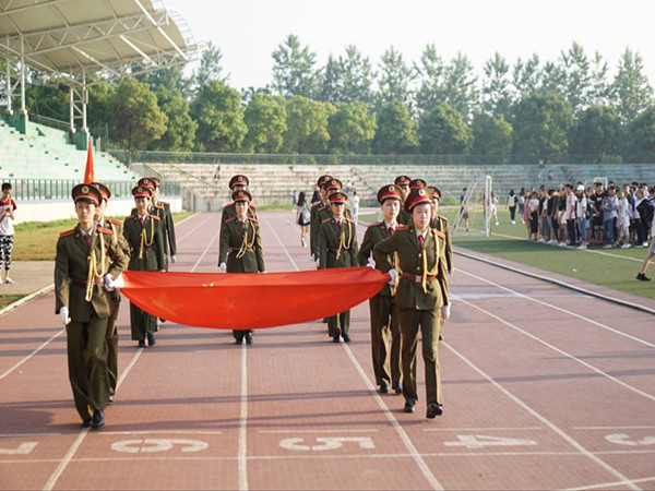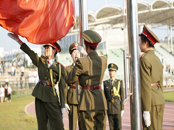 16名同学紧张的训练一周,同甘共苦只为让国旗缓缓上升、迎风飘扬。这一周里,他们早起早训、升旗前几日的特训、合训以及紧急集合训练。16文学专业的肖倩同学是一名“护旗手”,看着国旗缓缓升起,她的激动溢于言表:“站在旗台前,看着红旗冉冉升起,敬礼的手都在颤抖,雄雄国歌,震撼人心。那一刻,对国家充满着无限的敬畏。”