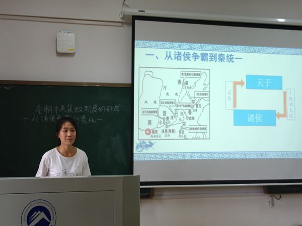 “元丰六年十月十二日夜,解衣欲睡,月色入户……”伴随着悠悠音乐响起,14级文学专业的王易新用舒缓的语调朗读了《记承天寺夜游》,她通过与李白的《古朗月行》作比较,从新的角度解读此文。而14级历史专业的易秋艳以秦朝中央集权制度的形成为课题,向我们展示了从诸侯争霸到秦统一的历史画卷,并细致分析了秦朝如何巩固统一。“社会经济、民心、变法、秦王的雄才大略等,这些都促使了秦朝的统一。”15级思想政治专业的孙闻博则将知识与实际相结合,激昂自信地告诉观众:哲学并不是高高悬浮于空中的思想楼阁,而是源于生活。随着讲课的深入,层层的剖析,观众的思维也跟着说课的内容拓展,抛出的课堂问题更是引发了观众的兴趣。