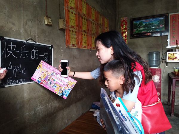 一个穿着绿色条纹衣服的女孩在村书记姚成庚的呼唤声中跑下楼来,带着羞涩的笑。这就是志愿者见到的第一个孩子——姚慧芝。“今年多大?上几年级啦?”钱子凡老师轻轻的摸了摸女孩的头。已上初中的女孩,面对志愿者们有些手足无措。外婆搬来了板凳,操着官话,与志愿者话家常。孩子的父亲去世了,妈妈独自在家做零工抚养俩姐妹……,谈及家里,这个饱经生活沧桑的老人微微耷拉下脑袋。“这一家人挺苦的,父亲一人承担所有开支,赡养年迈的老人,供养正在上学的小孩。”村长徐昌新说道。