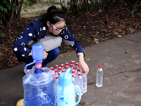 新生统一摆放的水杯旁,一位瘦小的戴着黑框眼镜的女孩正蹲着身子一次次摁着水桶为注有新生名字的近70多个水杯里注着水,再统一摆放整齐,以确保新生下训休息时都能喝到充足的水。