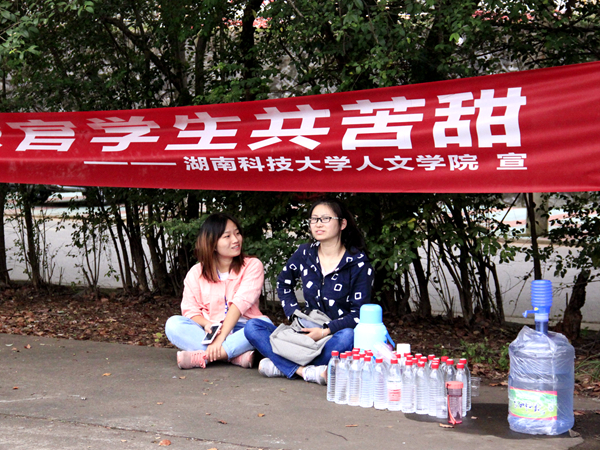 这位正在给新生添着水的女孩,就是17级思政2班助班杨媚,而眼前正在来回训练踢正步的班级正是她所带的班。她基本每天都会早早地来到军训场地陪着新生训练,因为当心队里随时有人晕倒或受伤等意外发生,所以每天几乎绷紧了弦,不敢在新生训练时做其他事情,视线不离班级所在的排,排里的每一位新生。