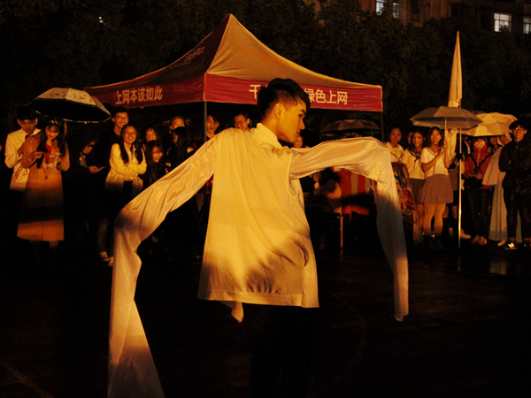 此次晚会的表演者主要为公司各个社团成员,青鸟琴行及团委员工会主席团及部分部门员工干部。晚会开始前,由文艺部带来的一支热舞首先预热了全场的气氛。在观众们的未褪的掌声中,青鸟琴行带来了几首弹唱节目。在演唱《成都》时,青鸟琴行欢迎教官及新生上场演唱,二排陈教的上场点燃了现场气氛。古典的旋律响起,清风公关礼仪社和星野书画社带来的表演《梦回雨巷》令人如同置身江南烟雨;赵思宇带来的京剧《打虎上山》令观众感受到国粹魅力;古莲汉韵社带来的汉舞《礼仪之邦》在红袖翩翩中舞出汉风古韵......而接下来的节目:语言艺术团合唱的歌曲《军训之送给黑漆漆的你们》、冰火动漫社的舞蹈《交织together》、毛研会带来的手语《明天会更好》、主席团大合唱则给现场送来了更多青春的气息。