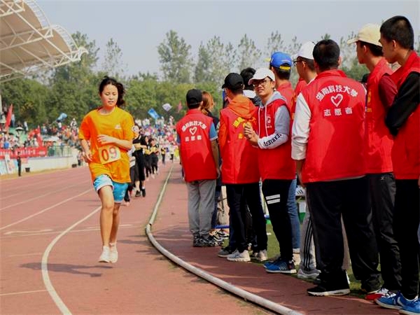 “人文,加油!春玲,挺住!”踏着节奏的点,在震耳欲聋的口号声中,beats365vip官网登录入口的院旗齐齐应景地飘扬在观众席上空,台下正值女子3000米赛场终点处,这狂热喧天的阵势,皆为16级新闻二班的宋春玲。