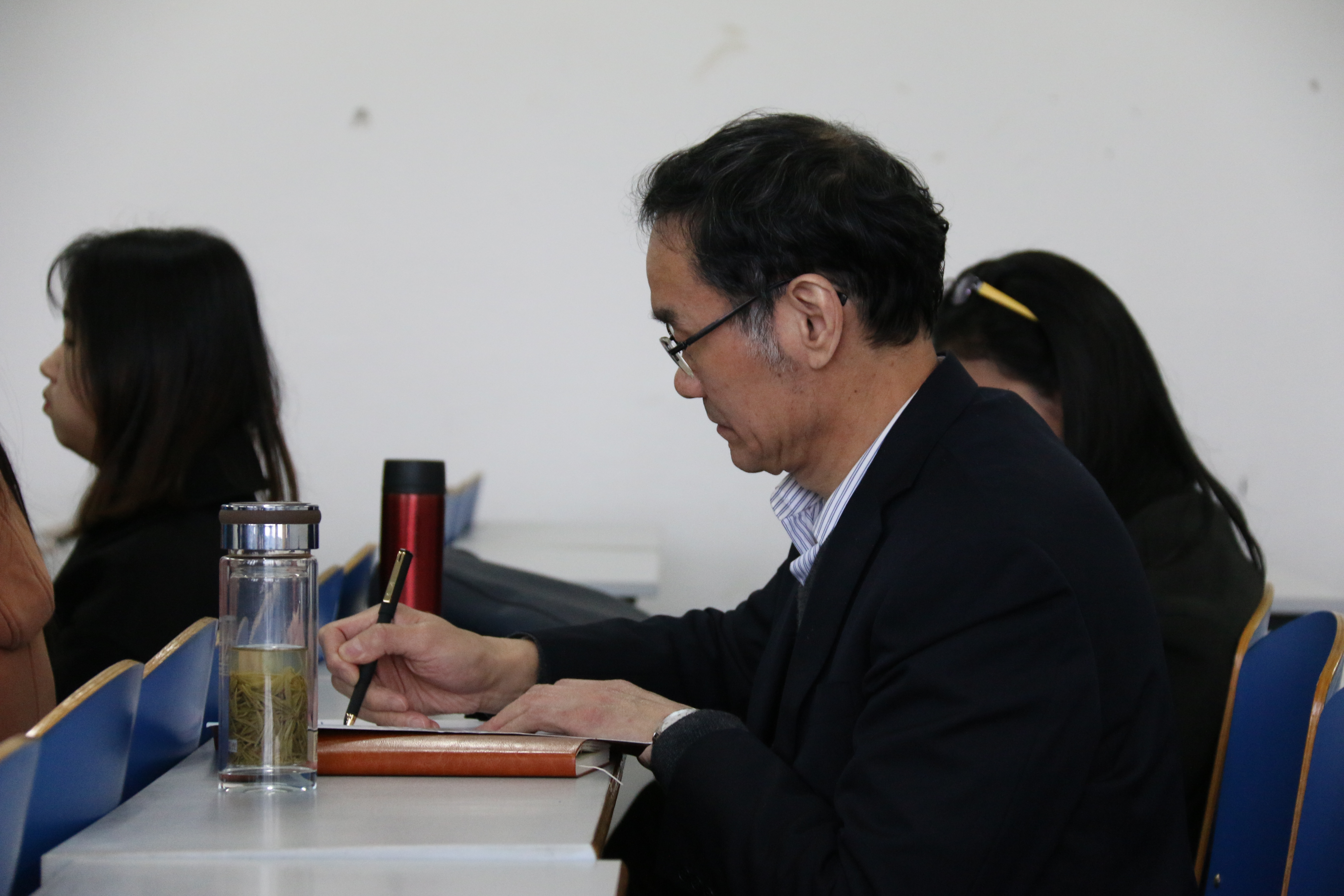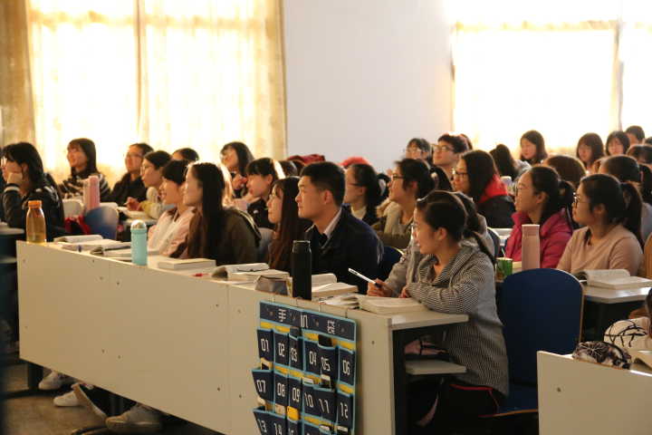 距上课还有15分钟,17级汉语言文学五班的同学们就已到达教室,主动将手机放入收纳袋中,然后回到座位上拿出课本,授课老师也早已到达教室,为上课做着准备。上课铃声准时响起,老师一边生动有趣地讲解,一边在黑板上工整地板书。同学们被精彩的内容深深吸引,瞪大了眼睛望向黑板,时而手撑下巴蹙眉思考,时而低头握笔快速记录。课堂上师生们积极互动,每当老师抛出问题时,同学们都耐心思考,然后踊跃发表自己独到的见解;遇到重难点时,同学们也会马上向老师提出疑问。随机听课的专家们坐在教室最后一排,或观察员工的听课状况,点头应和老师所讲授的内容,或埋头整理考察记录。两节课下来,同学们纷纷表示,老师讲的知识点让人受益匪浅,远离“低头一族”让他们感受到课堂的魅力。