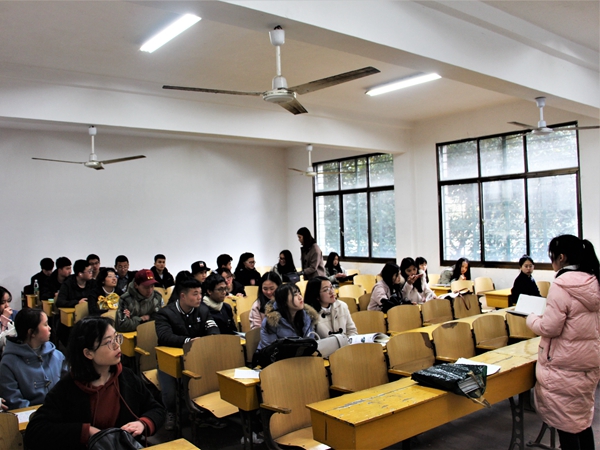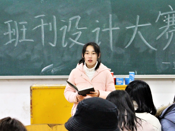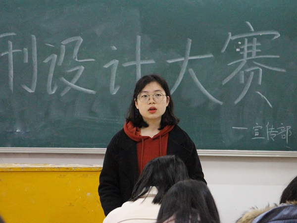 “各班自主设计的班级刊物应体现出专业特色,打造出各班级的个性亮点,同时有效弘扬正能量,展现当代老员工青春向上的风采风貌”。邬敏说道,她详细介绍了班刊设计与大赛的具体流程,主题和活动安排等。同时,宣传部人员发放了往届优秀的班刊作品以供各班作参考。随后,16级新闻一班黄姗姗作为往届优秀班刊制作者受邀上台介绍班刊制作经验。“我们班班刊起名为《问》,谐音‘新闻’的‘闻’。”黄姗姗首先介绍了班刊名的选定,随后,她从目录的制作及内容的选择等方面分享了班刊的制作过程。她建议,各班在制作班刊时的排版要尽量简洁明了,字数与页数可根据各班特色决定,尽量将班刊电子版导出为PDF格式,再拷贝到U盘中,以便于决赛展示。
