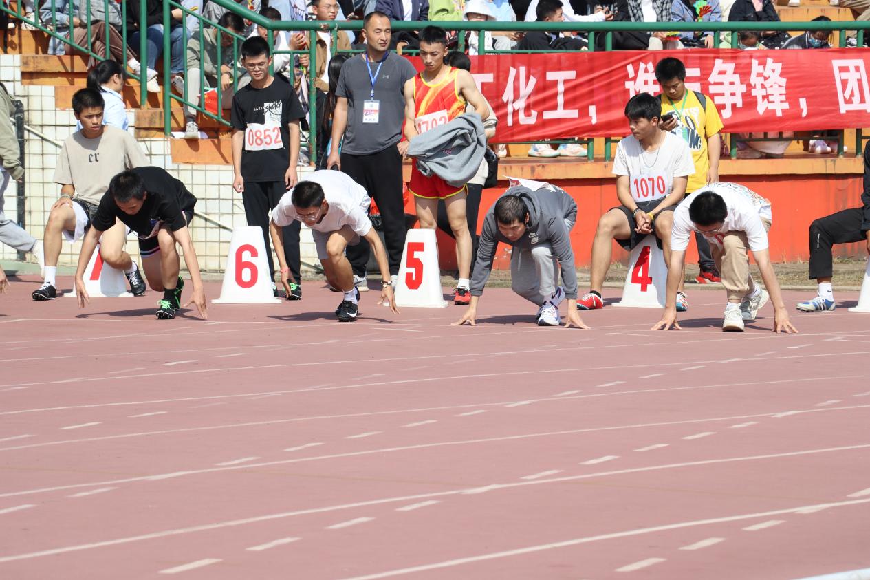 赛场上,加油声、欢呼声此起彼伏,将在场师生的热情彻底激发。“预——备”,随着裁判员一声令下,运动员们个个摆好姿势,左腿向前屈伸,右腿微微卧下,蓄势待发。在“砰”的一声枪响后,运动员们像离弦的箭一般冲了出去。