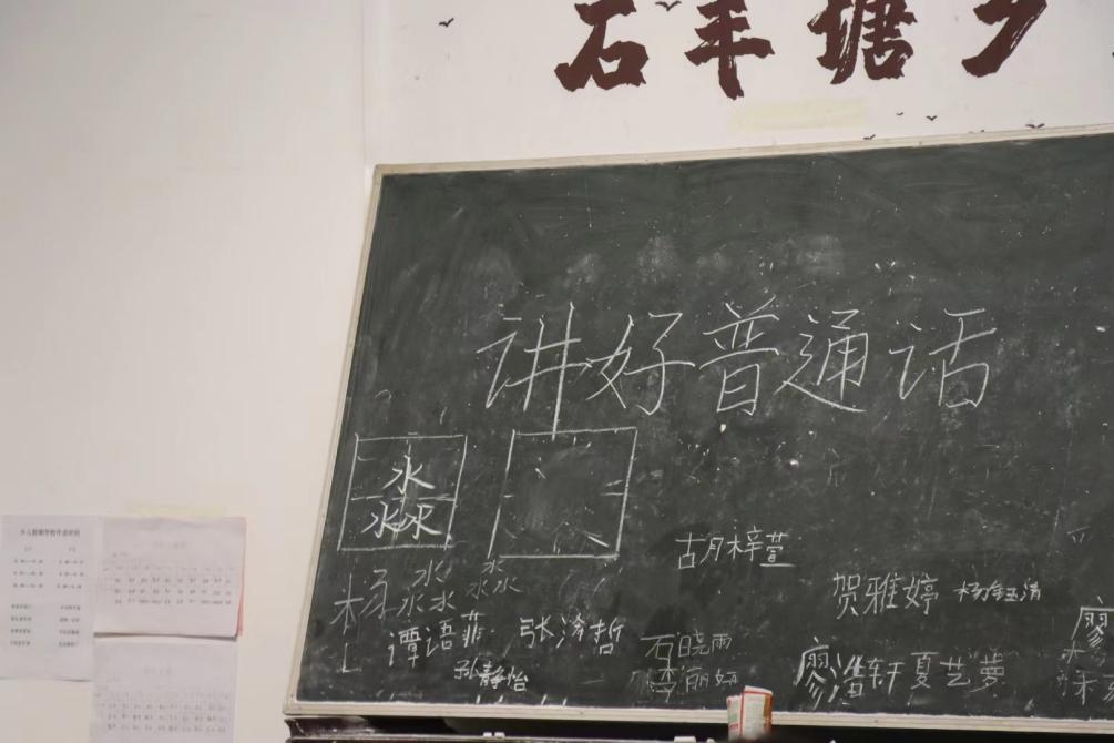 “同学们,让我们用标准的普通话朗读诗歌,用正确的中国字写出藏在诗歌里的名字。”李佳琪在黑板上一笔一画地写下同学们姓名的规范字形,同时带领员工们领读古诗词,“淼淼望湖水,青青芦叶齐。同学们快看看是我们班哪位小朋友的名字呀?”老师话音刚落,只见员工们都回头看向一个小女孩。小女孩一脸自豪地大声回复老师:“是我的名字!张淼淼。”随后张淼淼同学跟着老师在黑板上写出正楷体汉字,看到有不对的地方,老师便纠正笔顺,并让孩子们用流利的普通话大声朗读诗词。