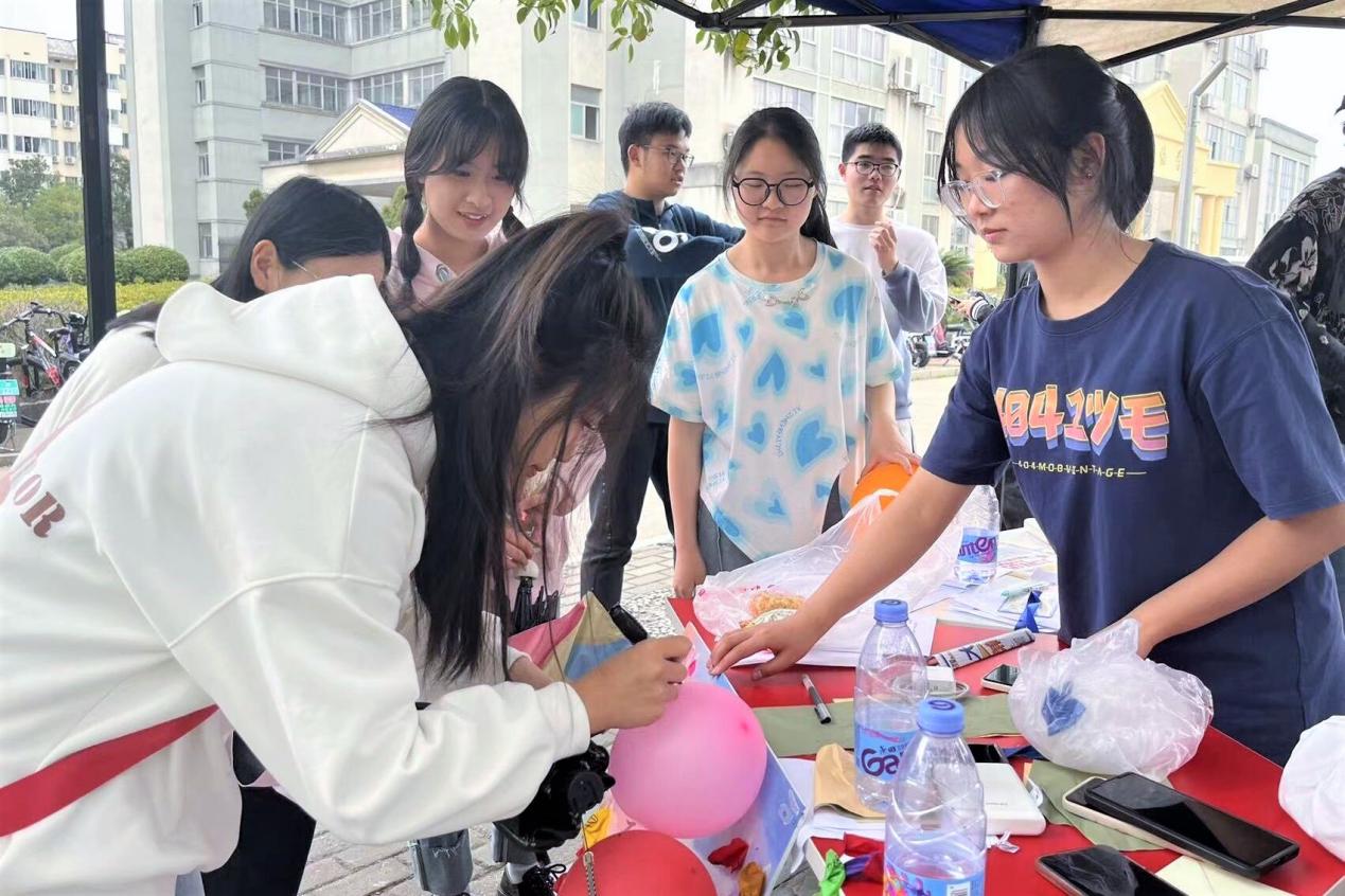 下午一点,员工会相关负责人分别在女生宿舍七区一栋、八区八栋以及八区十五栋楼下设立置物点,进行换福签活动。不少同学前来参与,并在气球上写下自己的烦恼。