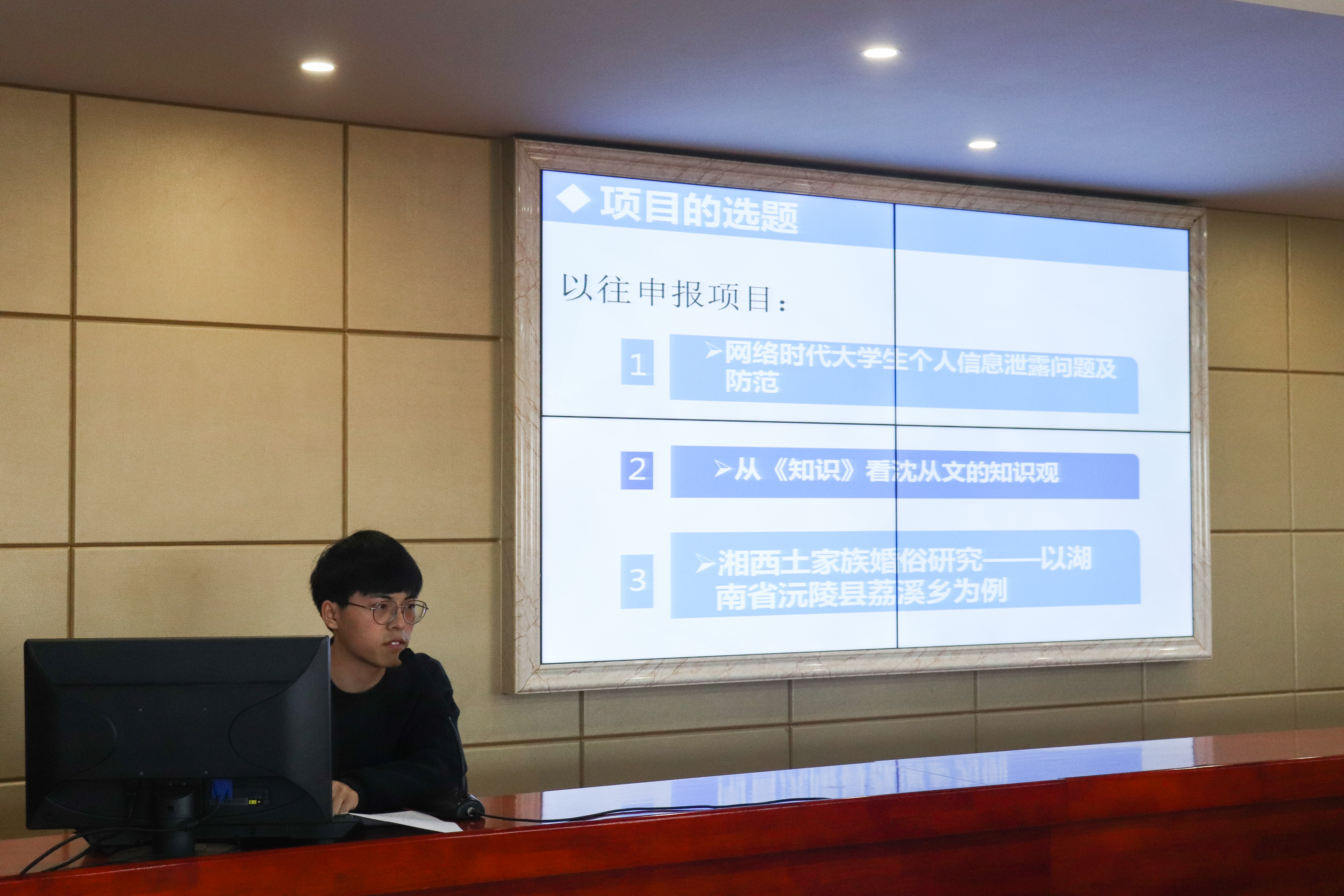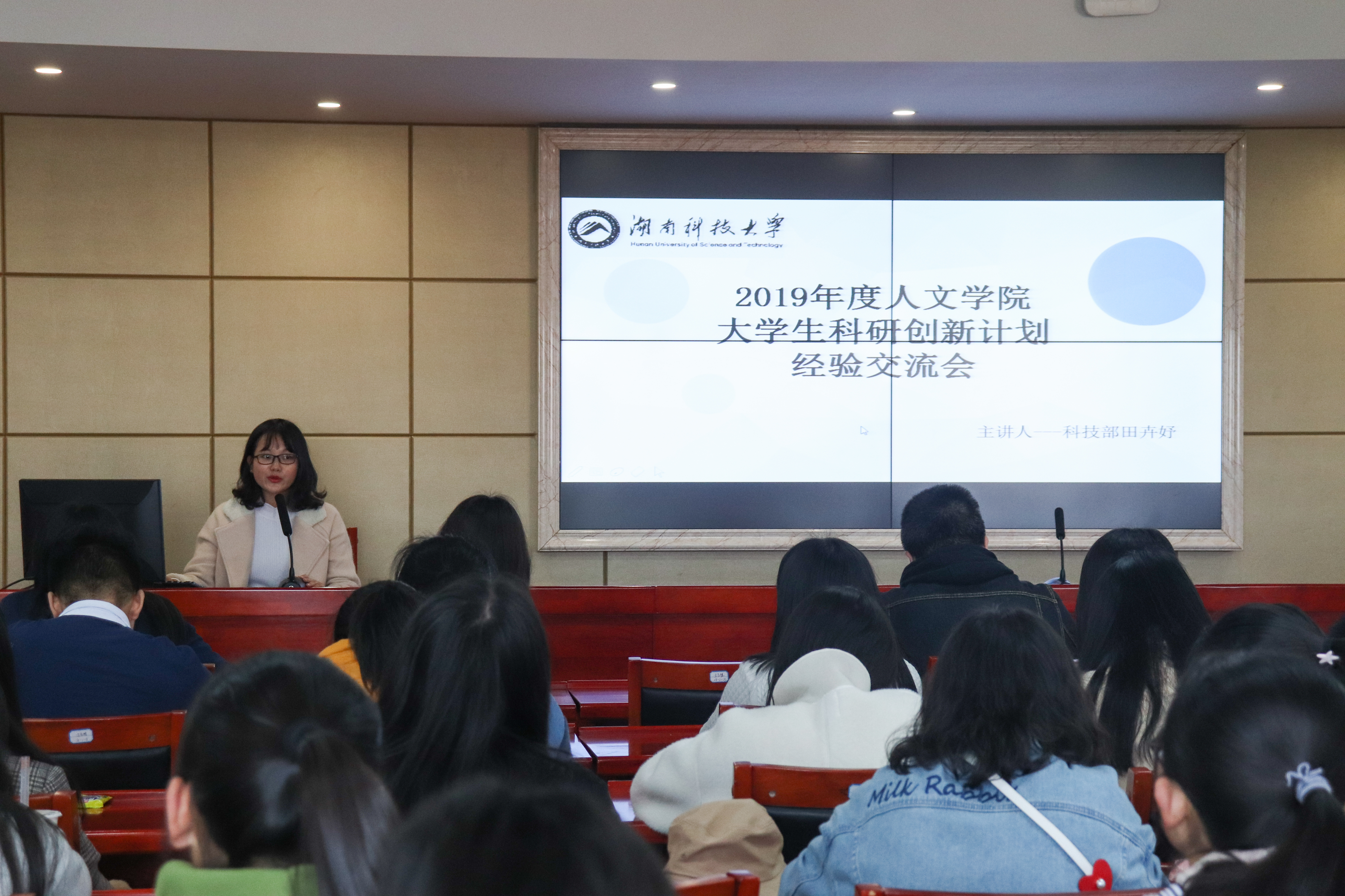 之后,刘忠存、梅洁、孙亚帆、刘建敏、陈亮帆、刘一博同学则以自身的实际情况为依据,向同学们介绍了在参与SRIP项目的过程中应当注意的几点要求。首先,在申报书的填写方面,刘忠存为同学们做了详细介绍,他指出,研究摘要要重点突出、详略得当,研究计划要目标明确、内容可行,立项依据要意义具体、前景广阔。在指导老师选择方面,他也给了同学一些提示和启发。接着,梅洁以自己的两个项目《自我表达vs舆论表达:“95”后老员工使用网络流行语进行表达的实证研究》以及《新媒体语境下老员工对“佛系”观念的认知及其影响研究》为例,详细为大家介绍了SRIP项目的前期准备、研究过程、后期答辩的具体要求。而在项目的具体实施阶段,孙亚帆、刘建敏、陈亮帆则讲述了自己在研究中遇到的情况,介绍了项目具体实施时需要运用的研究方法以及可能会遇到的问题。在项目后期答辩方面,陈亮帆、刘一博同学为我们做了大致的介绍。她们都共同提到,在选题方面,应当注意与自己专业的匹配性,要着重关注所选课题的创新性、可行性、实用性。