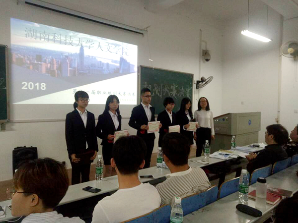 决赛在主持人说明比赛规则后正式展开,本次比赛分为选手上台讲演与评委答辩两个部分。九位选手依次上台,通过展示PPT与讲解得方式进行自己的职业规划阐述。选手们主要围绕对职业的认识、自我性格特征、就业背景与环境、具体实践以及评估调整等几个方面进行阐述,将自我梦想与现实境况相结合,对自己将来选择的职业进行全面理性的分析规划。来自思政3班的郑惠虹同学根据自己的性格特征来明确阶段目标和职业方向,“我是一个性格坚韧开朗,理性内敛的人。”因此她希望自己以后作一名大学思政教师。讲解中,她通过提出三个问题:“我是个什么样的人?我要做什么样的事?我要怎么做这件事?”来对提升自我的部分进行引导。最后,她引用毛泽东的名句“多少事,从来急;天地转,光阴迫”来勉励自己不断前行。汉语言文学1班的熊沁婉同学对所选择职业充满坚定的信心,在面对老师提出的问题时思路清晰地给出答案,赢得同学们阵阵掌声与赞叹。