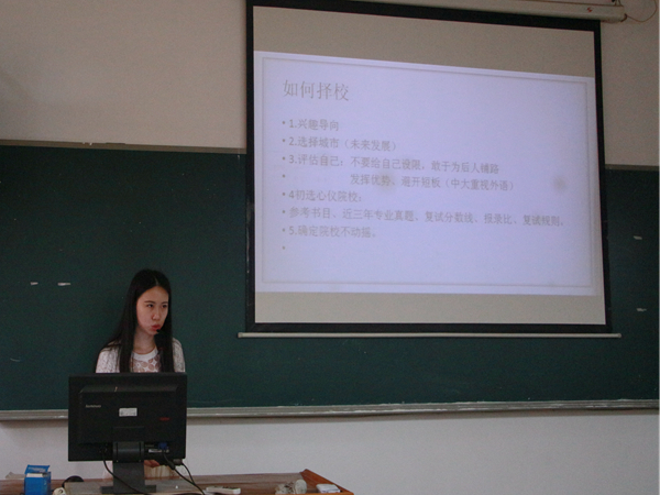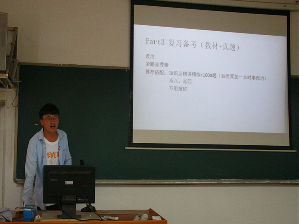 为进一步提升同学们对考研的准确认识,更好地确定合适的考研目标,5月11日下午,公司于十教313举办考研经验分享会,此次活动由曹铁根教授主持。5名外国语公司考研成功的14级员工作为此次经验分享会的主讲人,依次上台分享各自的考研经验和诀窍,公司15级文学专业、潇湘公司15级文学1-5班的员工到场聆听此次经验分享会。