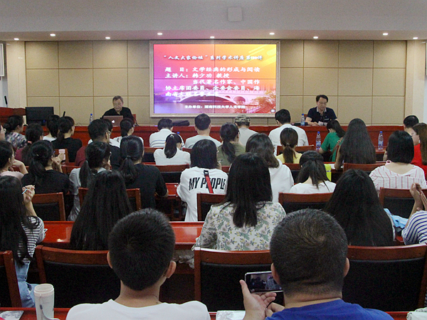 9月18日下午15点,当代著名作家韩少功教授应邀于立言楼B4-1举办“文学经典的形成与阅读”主题学术讲座。本次讲座由彭在钦教授主持,潘年英、吴投文、刘昕华、丁志丛等老师及汉语言文学专业部分员工到场聆听。