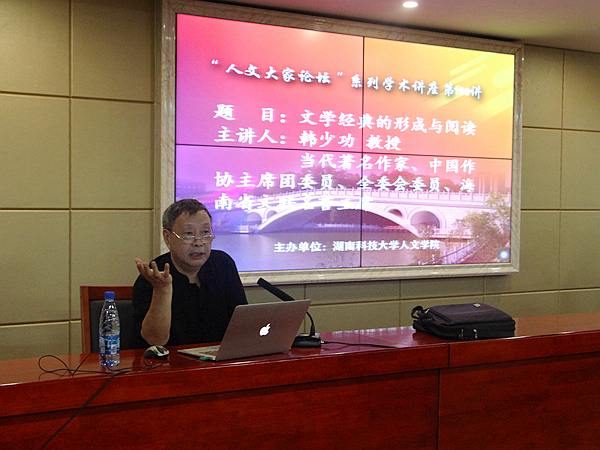 讲座伊始,韩少功教授以当今诸多“经典书单”为引,提出“什么是经典”的问题,并用陶渊明、鲁迅、民国畅销书作家张恨水等经典作家说明不能以发行量、长度和暂时的社会影响力作为经典的评判标准。接着,韩教授讲述他眼中的评定标准:创新上有难度、价值上有高度、可以引起广泛的共鸣。“一部经典,应当具有跨越时代、地域、阶级、民族、宗教的能力,具有普世性和恒久性。”同时,韩教授也十分赞同意大利作家卡尔维诺的观点“经典不是我们正在读的书,而是我们正在重读的书”,作为一部经典,必然有被人反复品味、思考的价值。