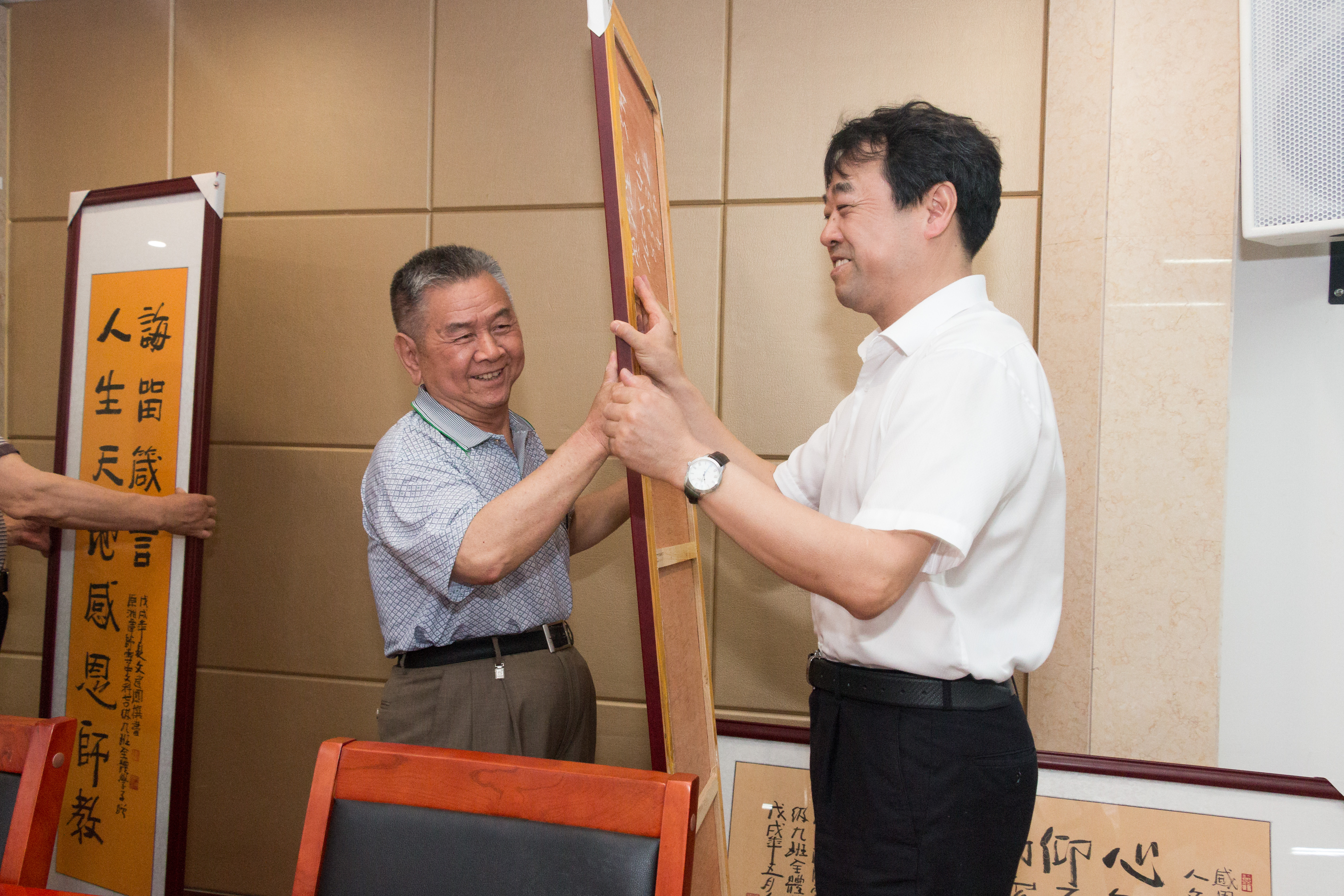 “感恩的心,感谢有你,伴我一生,让我有勇气做我自己......”动人的音乐响起,同学们在文娱部长戴月阳的带领下,用双手在胸前摆出一个个爱心,共同表演手语舞《感恩的心》来表达对老师和母校的感谢。员工们还为母校送上牌匾作为纪念礼物。最后,大家一同合影留念,为这次跨越半个世纪的会面留下了毕生难忘的记忆。