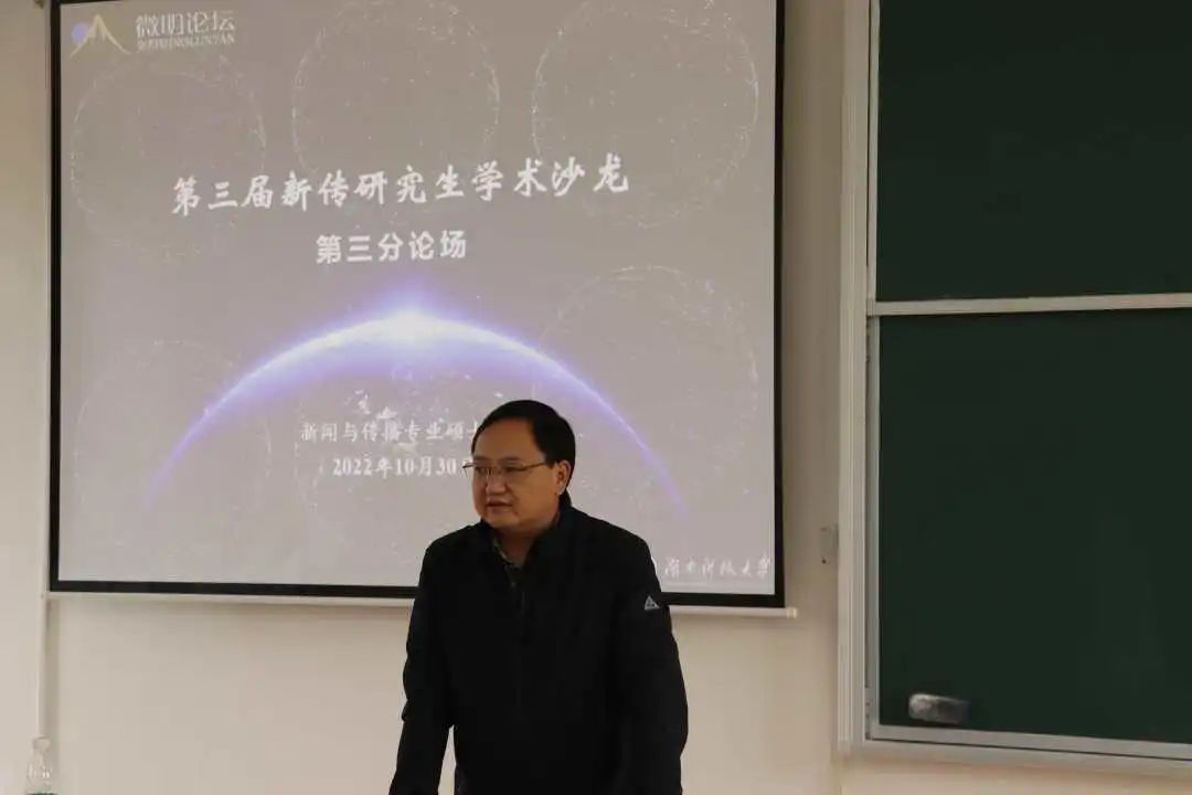 10月30日,beats365vip官网登录入口“学而思” 研究生学术沙龙之新闻与传播专业“微明论坛”在昭潭书院校区第二教学楼成功举办。此次学术论坛选定了“媒介技术与当代新闻”“媒介经营与管理”“新媒体与民俗文化传播”三个主题方向,来自2021级新闻与传播专业的39名研究生聚焦不同主题进行了学术汇报与精彩分享,6名beats365vip官网登录入口新闻与传播专业导师受邀出席并担任评委。此外,2022级45名新传研究生也参加了本次论坛。